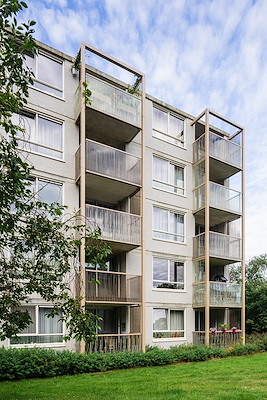 Deze tweezijdigheid, de stad- en de parkzijde (op zuid en op noord) en de eerste aanzetten in het gebouw om tot meer individualisme en echt een eigen woonplek te komen (weg van de eenvormigheid, monotomie en anonimiteit uit de jaren 50 en 60) hebben we opgepakt om het complex op te frissen en te verduurzamen.