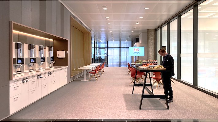 “Voor het kleur en materiaalconcept sluiten we aan bij de Zuid-Hollandse landschappen: water, groen, zand en ook de industriële omgevingen van de havens. Voor dat laatste gebruiken we warm grijze en rood-bruine tinten. Op de 2e en 3e verdieping hebben we grote groenwanden met echte planten en ook in werkruimtes laten we veel planten terugkomen. We hebben materialen en toepassingen met de gebruikers samen ontworpen. Ook het kunstplan is onderdeel van de inrichting geworden, veel van de kunst die er in het gebouw was heeft een nieuwe plek gekregen. Het hele gebouw is als het ware ‘leesbaar’ geworden en ook als bezoeker weet je steeds waar je je in de ruimte bevindt. Dat voelt voor iedereen prettig.”