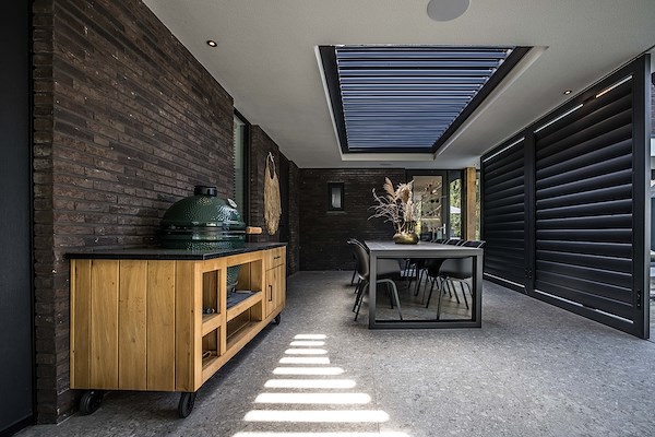 De achtertuin van deze door Swinkels Architecten ontworpen nieuwbouwvilla uit Eindhoven is een zomers paradijs, voorzien van zwembad met waterval en een jacuzzi. Op de veranda is het goed vertoeven. De tafel is direct onder het louvredak geplaatst, zodat men in de avond voldoende licht heeft en op zomerse dagen voldoende ventilatie. Warme lucht krijgt bij een open