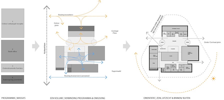 Het programma van het nieuwe ontvangstgebouw is onder te verdelen in vier functies; ontvangsthal, backoffice, ondersteunende functies en buitenopslag. De functies zijn vormgegeven als vrijstaande volumes, dit versterkt de verbinding tussen het programma en omgeving. Door de bestrating naar binnen door te trekken wordt de overgang van buiten naar binnen versterkt.