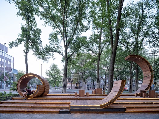 Studio PolyLester heeft een levendige en uitnodigende stadsoase gerealiseerd aan het Weesperplein, in het centrum van Amsterdam. Gabriel Lester, oprichter van PolyLester, was de winnaar van de stedenbouwkundige ontwerpwedstrijd uitgeschreven door de gemeente Amsterdam en creatieve hub