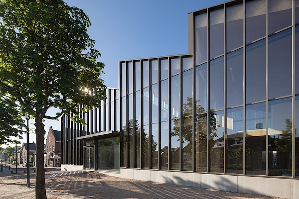 De transparante voorgevel laat het interieur aansluiten met het dorp. Het gebouw opent zich letterlijk door het gebruik van veel glas. Een sterk verticaal reliëf in deze gevel opent en sluit het interieur wanneer je het gebouw passeert. De rooilijn van de voorgevel wijkt waardoor de historische verbinding met de Molenstraat visueel wordt hersteld.