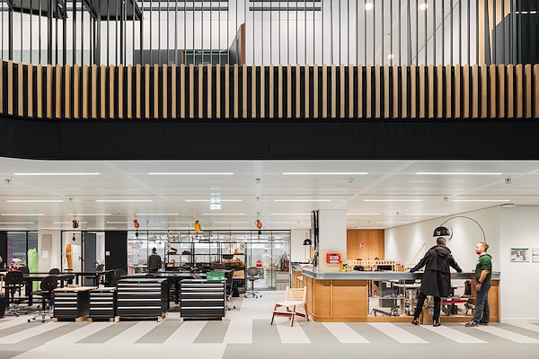 Het interieurontwerp (door Studio Groen+Schild en Ex Interiors) is ontstaan vanuit de behoefte naar een vernieuwend onderwijsconcept waar synergie, samenwerking, zelfstudie en innovatie worden gestimuleerd. Samen met de grondlegger en visionair van het huidige gedachtegoed Gerard van Haarlem - in memoriam - is er een open community building ontstaan met verbinding naar de stad. Door open ateliers, flexibele interieurelementen en een eenduidig kleurenpalet op de verdiepingen van grijs, zwart en felle kleuraccenten, is er een connectie ontstaan tussen ‘tech & touch’.