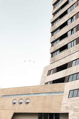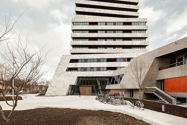 De originele Bunker van Huig Maaskant is een brutalistische klassieker met krachtige lijnen, robuuste materialen en massieve volumes. Na het verdwijnen van de studentenverenigingen, raakte De Bunker in verval. Wij hebben er bewust voor gekozen om het bestaande gebouw te behouden, in plaats van te slopen. Door een toren van 100 meter te realiseren, konden we voldoende waarde creëren om de zorgvuldige renovatie mogelijk te maken en heeft de historische plek een nieuwe bestemming gekregen. Na oplevering krijgt De Bunker de status van gemeentelijk monument. We hebben de oorspronkelijke details, zoals de blauwe en oranje mozaïek, zoveel mogelijk in ere hersteld. Ook in de materialisering van de toren is voortgeborduurd op de originele Bunker. Het beton van het bestaande gebouw is in de toren vertaald naar natuursteen: een grijze granietsoort met marmerachtige tekening. Dit is gecombineerd met glas en hout, materialen die ook in het werk van Maaskant terugkomen. Oude details van de voormalige corps ruimte, zoals de betonnen open haard en opvallende rode stalen balustrade, zijn zorgvuldig gerenoveerd en sieren de horecaruimte.