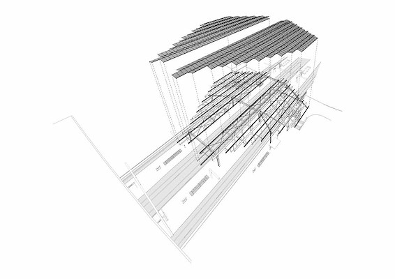Twee grote luifels overspannen de rails en waaieren aan beide zijden van de platforms uit als gigantische, beschermende vleugels. Het station heeft niet alleen zonnepanelen op het dak, zoals vaak wordt gedaan, maar is volledig opgebouwd uit bi-facial zonnepanelen, wat heel nieuw is. De zonnepanelen zijn in oost-westelijke richting geplaatst met een hoek van 10-15 graden, waardoor een zigzag oppervlak ontstaat dat optimaal is om zonlicht op te vangen. Afhankelijk van het tijdstip van de dag kunnen deze zonnepanelen de zon zowel van de oost- of westkant als van de onderkant opvangen en weerkaatsen via de vloer. Tussen de panelen zorgen smalle goten voor de afvoer van hemelwater. Bij de liften geeft een glazen luik toegang tot het dak, waardoor de overkapping eenvoudig te reinigen en te onderhouden is.