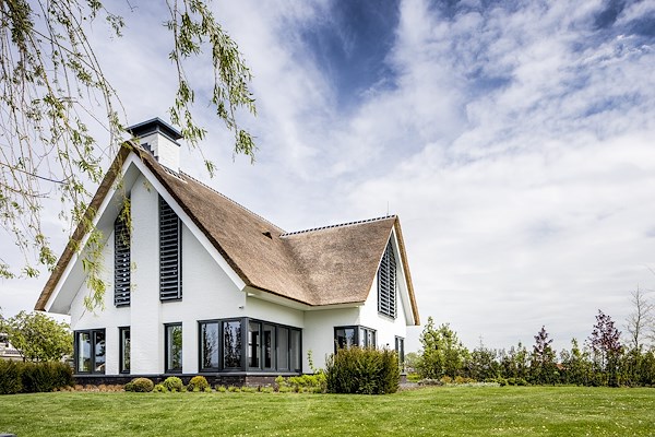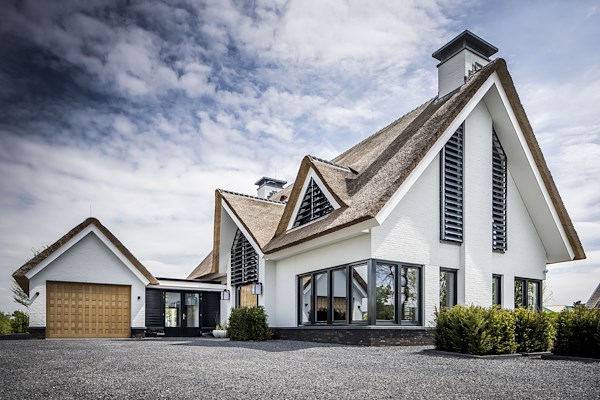 De landelijk moderne villa wordt gekenmerkt door de witte gekeimde gevel, het rieten dak en de zwarte aluminium lamellen. Zowel de voor- als garagedeur zijn van eikenhout. Op het dak van het bijgebouw liggen PV panelen. De woning heeft een bodem warmtepomp en gebalanceerde ventilatie. De kozijnen zijn van hout en voorzien van HR++ glas.