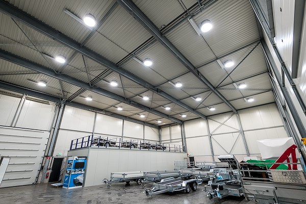 Anders dan de showroom heeft het opslaggedeelte van het bedrijf een enorme glazen pui en daar tegenover ook nog ramen die voor daglichttoetreding zorgen. En toch bleef er in het midden van de ruimte behoefte aan extra daglicht. De locatie van twaalf tubes Ø 53 cm in het midden van de opslag zorgt in combinatie met de pui en de ramen voor een gelijkmatige daglichtverdeling.
