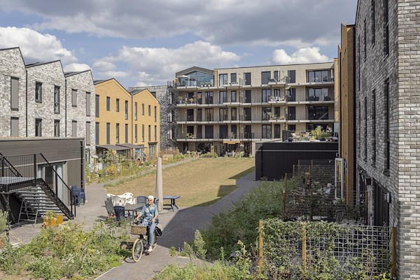 The apartment blocks are situated at the ends. At the Stationloper it has a commercial plinth on the ground floor with 4 layers. Above this are a total of 16 homes that are accessed by a wide deck and private terraces on the inside of the block. The apartment block at Statenbolwerk is 5 stories with approximately 25 homes. This block also has a wide deck and private terraces on the houses in favor of orientation and contact with the inner area.
