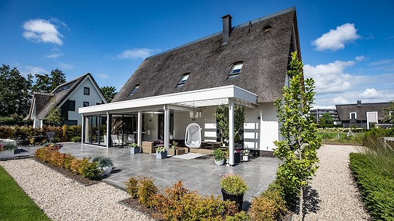 De bewoners van deze moderne woning hebben direct een slaap- en badkamer op de begane grond gerealiseert. Om niet in te leveren op hun ruimte op de begane grond, hebben ze gekozen voor een ruime aanbouw. Deze aanbouw fungeert als berging en een gedeelte van de keuken.