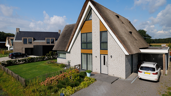 De bouwstijl van de woning is zeker modern te noemen. De woning heeft een strakke vormgeving, welke vooral naar voren komt in de opvallende risaliet aan de voorzijde van de woning. Hierbij is gebruik gemaakt van natuurlijke kleuren en deze komen mooi terug in de voortuin van de woning. Aan de achterzijde is gekozen voor een ruime veranda. Zo zijn onze opdrachtgevers in staat om altijd droog en koel te genieten van hun achtertuin.