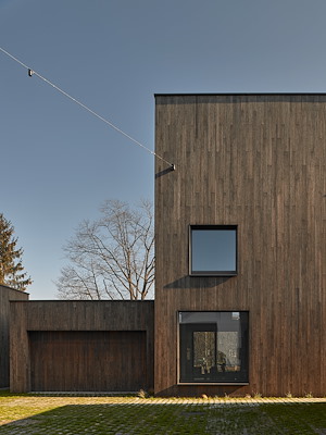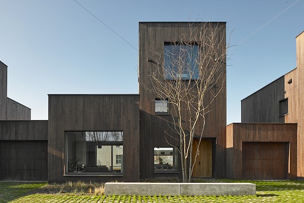 De verschillende volumes staan in een zorgvuldig afgewogen relatie tot elkaar zodat bezonning, doorzichten en uitzichten optimaal zijn. De buitenruimtes liggen, door middel van lage afscheidingen afgekaderd, aan de buitenzijde van het cluster en vormen een intermediair tussen woning en openbare ruimte, het boslandschap. De gevels zijn voorzien van hoge staande, zuiver vierkante en langwerpig liggende gevelopeningen, zodanig geplaatst dat ze de abstracte compositie versterken. De gevelafwerking is van onbehandeld bamboe, dat in de loop der tijd mooi egaal vergrijsd. Het collectieve hof en de privé tuinen zijn ontworpen door Studio Blad. De hof wordt voorzien van hergebruikte Zweeds graniet keien met brede grasvoegen, zodat hemelwater goed infiltreert. Er zijn meerdere plant- en boomvakken aangebracht en er is centraal in de hof een betonnen zitelement met een bovenvlak van gepolijst beton.
