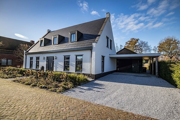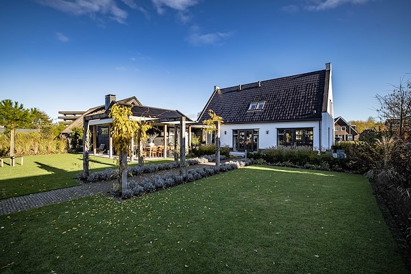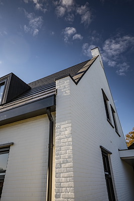 heeft ook een vleugje van de moderne stijl. Dit komt vooral naar voren in het kleurpallet. Het witte gevelsauswerk staat mooi in contrast met de donkere trasraamstenen en de donkere kozijnen van de woning.