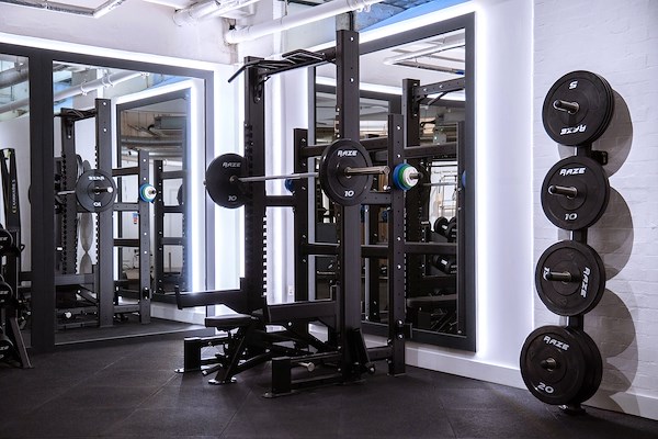 At the other end of the space are two custom designed Zenith half racks with the plate storage removed and relocated on the walls to the side. The half racks have been designed to be as shallow to the wall as possible to maximise floor space. They also have glute drive and band peg attachments for added functionality. To the left of the rack are the Zenith PU dumbbells housed on a shadow series storage rack with Zenith adjustable benches in front. Surrounding all of the above elements are large amounts of open floor space to create the flexibility for both PTs and clients to carry out their sessions.