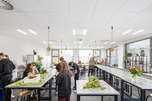 De Dordtse vestiging van Yuverta, waar 435 mbo-studenten en 780 vmbo’ers les volgen, wil graag koploper zijn in groen onderwijs. Daar hoort uiteraard een duurzaam gebouw in een inspirerende groene omgeving bij. Het is een plek geworden die aanzet tot samenwerking en ontmoeting.