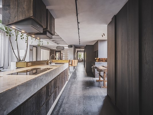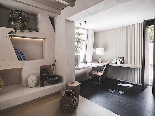 Met het minimale materiaal- en kleurgebruik is een ingetogen en sobere basis ontstaan. Door de basale vormentaal en ambachtelijke materiaalgebruik komt het verfijnde meubilair optimaal tot zijn recht. Dit zijn grotendeels vintage vondsten gecombineerd met nieuwe meubelen.