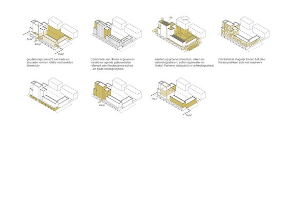 Het gebouw maakt sprongen op meerdere schaalniveaus, letterlijk en figuurlijk. Van het in hoogte verspringende hoofdvolume, tot gevels die terugrooien ten opzichte van de straat, van plastiek dat verschilt per toren, tot poorten op maaiveldniveau, van goudgekleurde kozijnen tot her en der een goudgele steen in het metselwerk, van woonprogramma op de verdiepingen tot commerciële ruimten in de plint. Het resultaat is een fraaie sculpturale verschijningsvorm van genuanceerd metselwerk, waarmee de historische lijn van fraaie baksteenarchitectuur in Groningen is doorgezet en waarmee een spraakmakende nieuwe voorkant van de wijk is ontstaan.