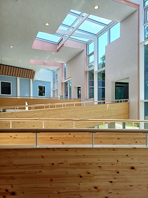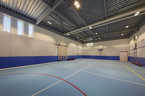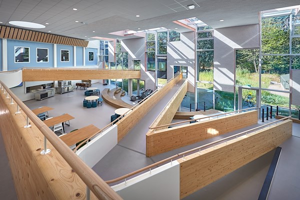 Rondom de centrale hal, het hart van de school, liggen leslokalen, praktijklokalen, overlegruimtes en twee gymzalen. Vanuit elke ruimte ben je spreekwoordelijk drie stappen verwijderd van de hal en daardoor gevoelsmatig verbonden met de anderen in de school. De sculpturale hellingbaan verbindt de twee verdiepingen, met beneden leerlingen van Dagbesteding en boven die van Arbeid. Door het natuurlijke hoogteverschil in het terrein hebben beide verdiepingen een eigen entree.