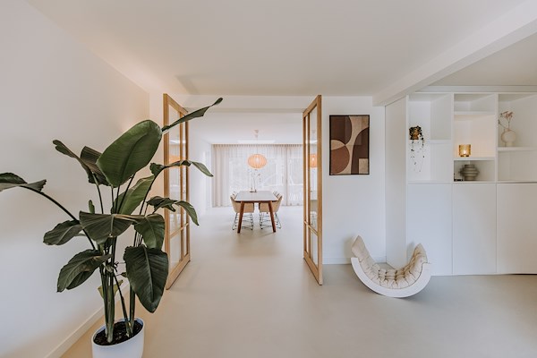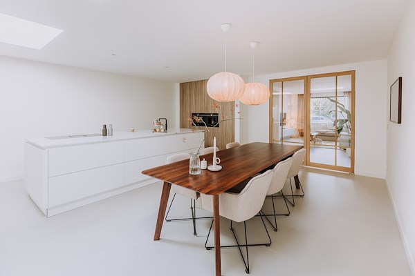 Bij dit project hebben we een dubbele eiken taatsdeur geleverd en een enkele taatsdeur. Deze massieve binnendeuren zijn afgewerkt met een biobased matte lak, dit behoudt de natuurlijke uitstraling van eikenhout. Doordat er gekozen is voor een dubbele taatsdeur van kamer naar keuken geeft dit een strakke en rustige uistraling.