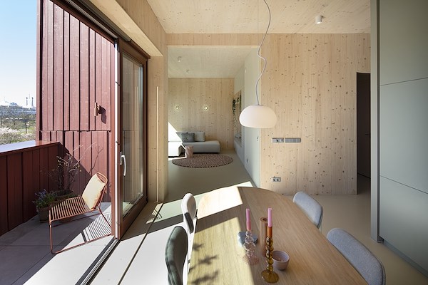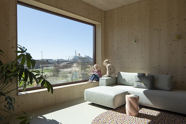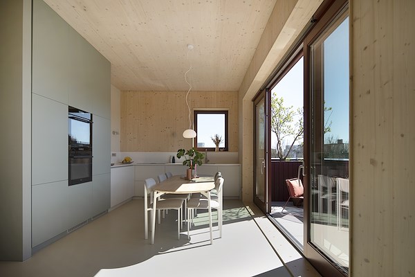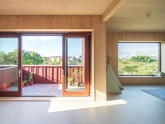 In het interieur is de CLT constructie in zowel de plafonds als de wand zichtbaar gelaten.