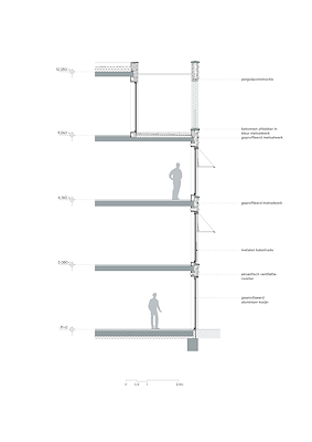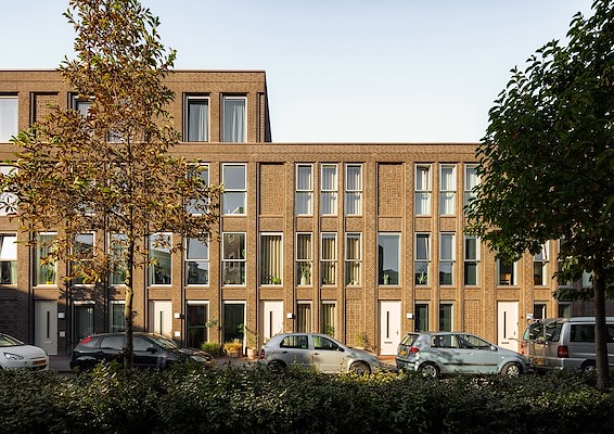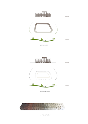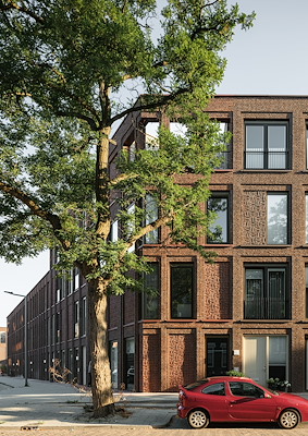 Aan de buitenzijden zijn de blokken opgezet in geprofileerd metselwerk, dat steeds opener wordt en langzaam van kleur verloopt van de wijk- naar de parkzijde. Hierdoor sluiten de blokken zowel aan op de rood bruine baksteen architectuur van de vroeg 20e eeuwse wijk, als op de openheid en lichtheid van het Dakpark.