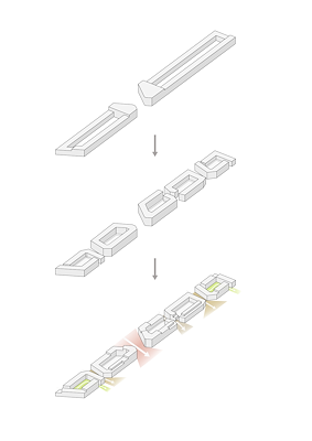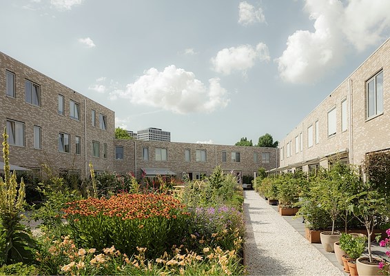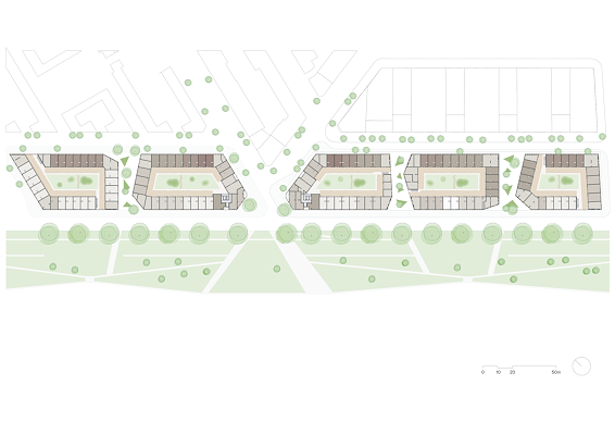 Vijf gesloten bouwblokken, elk met een eigen karakter en een zeer gedifferentieerd woonprogramma, zijn voorzien van een binnentuin op de eerste verdieping – aangelegd bovenop de gelijkvloerse parkeervoorziening met een dik grondpakket. Elk binnengebied heeft daarbij zijn eigen inrichting, met een meer collectieve of private structuur.
