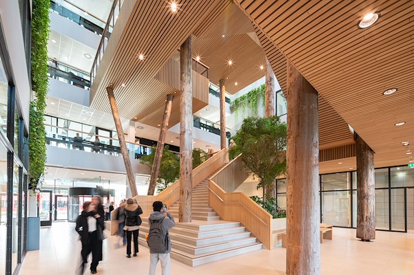 Uit de workshops met de studenten kwam naar voor dat een onderwijsgebouw huiselijk, warm en met veel natuurlijke materialen moest zijn. Het onderwijsgebouw is ontworpen met een biofilisch ontwerpstrategie waarbij de natuur als het ware naar binnen wordt gehaald. Het gebouw bevat transparante gevels wat zorgt voor een natuurlijke verbinding met de omliggende campus waarbij daglicht tot diep in het gebouw kan doordringen. Daarnaast is er veel groen en hout te vinden in het universiteitsgebouw. De atriumconstructie bestaat namelijk volledig uit echte houten boomstammen. Deze boomstammen zijn afkomstig van Kroondomein het Loo en zijn onbewerkt en constructief toegepast. Kenmerkend voor het ontwerp is de groene studieomgeving en de houten zogezegde “boomhut” in het atrium. Dit zorgt voor een warme, huiselijke en aangename beleving in het gebouw en er wordt een omgeving gecreëerd die bijdraagt aan het welzijn en de gezondheid van de studenten.