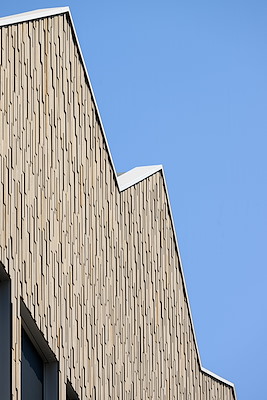 Een opvallend kenmerk van de nieuwe Stadswinkel is de hoogwaardig geïsoleerde houten gevel. De 90.000 geschroefde latten, van verschillende dikte, geven het gebouw een ruwe schorsachtige schil. In contrast daarmee zijn de houten kozijnen en vliesgevels blank gelakt. De transformatie is zo uitgevoerd dat alles later weer volledig te demonteren is: kitten en purren was verboden. Het gebouw heeft een kap gekregen om de installaties op een nette manier te integreren en de zonnepanelen in een ideale hoek te kunnen plaatsen. Door het toevoegen van die houten kroon transformeert de oude monoliet in een eigentijds huis van de stad.