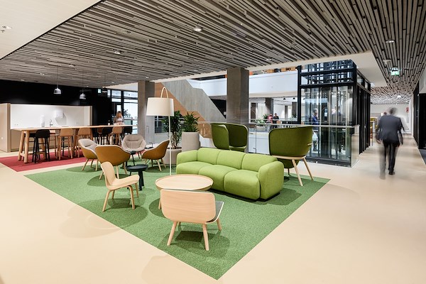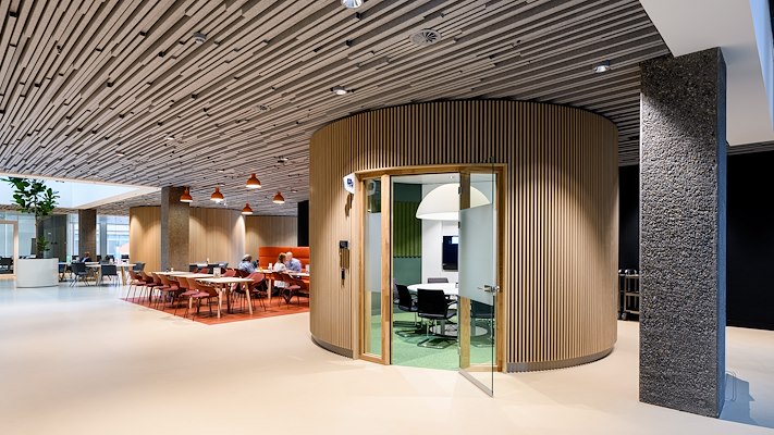 Ook in het interieur is veel hout toegepast. Daarnaast zijn de toegepaste materialen biobased (kurklinoleum gietvloeren) of gemaakt van gerecyclede producten (tapijttegels gemaakt van oude visnetten en plafonds van gerecyclede Petflessen). Alle meubels zijn losmaakbaar gemaakt met mechanische bevestigingen. Kasten zijn gemaakt van formaldehydevrij plaatmateriaal dat bestaat uit tarwestro en gerecycled hout.