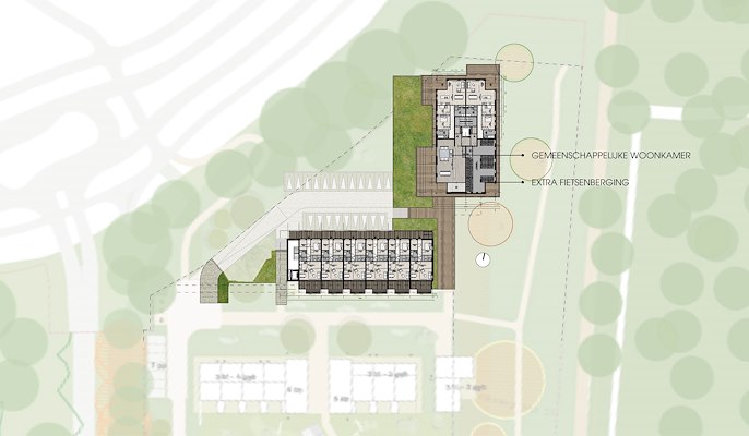 Door de verdiepingshoge vensters en grote, houten hoekterrassen is het mogelijk om tussen het groen te genieten van het uitzicht over het Sysseltse bos. Om samen te genieten van de groene omgeving en onderlinge contacten te stimuleren zijn op de begane grond van de woontoren collectieve voorzieningen opgenomen. Een gemeenschappelijke woonkamer is verbonden met de hoofdentree en geeft toegang tot een collectieve tuin. Naast de individuele berging in de kelderlaag is er een grote collectieve fietsenberging bij de entree om gebruik van de fiets te stimuleren.