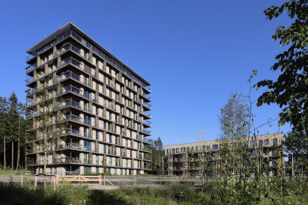 De twee appartementengebouwen in De Veluwse Proeftuin hebben een duurzame, groene gevel die de woningen verbindt met de bosrijke omgeving. MIX architectuur ontwierp deze eerste woningen op het terrein van het World Food Center (WFC) in Ede. De gebouwen zijn bouwkundig opgeleverd; de komende jaren zullen ze echter nog volgroeien tot groene voedseltorens op de grens van de Veluwe en het WFC.