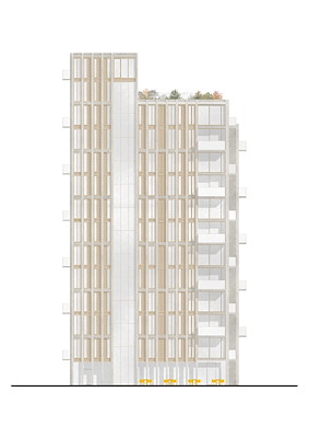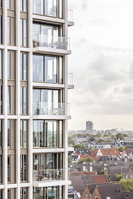The Singeltoren has a slender structure of 45 meters high, with 30 apartments of different sizes and two penthouses. The location was chosen in the heart of De Meelfabriek, next to the newly built student accommodation and on top of the parking garage. The ground floor contains commercial space, which reinforces the involvement with the environment. The result shows how high and low-rise buildings and old with new architecture can be combined on a relatively small surface in the contemporary urban structure.