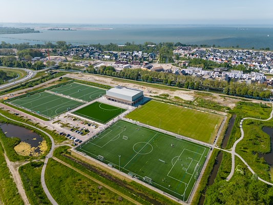 Circulaire sporthal Bredius is de nieuwe thuisbasis van SC Muiden. Het ensemble van de sporthal, het sportpark en de strook langs de Trekvaart vormen de landschappelijke entree van Muiden en de Krijgsman. Sporthal Bredius bestaat uit een hoog volume en een luifel met kolomstructuur. Hierdoor geeft de sporthal expressie op de verschillende schaalniveaus in gebruik, sportbeleving en functionaliteit.