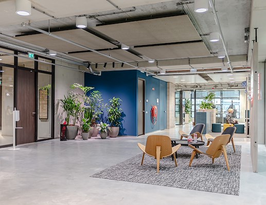 Deze oplossing werd gevonden door OWA RAW Concrete plafondpanelen bij de entree te plaatsen. Het geluid van o.a. bellende gastvrouwen wordt goed opgevangen dankzij de hoge geluidsabsorptie van de panelen. OWA RAW Concrete oogt als beton, waardoor het naadloos binnen het robuuste ontwerp van het pand past. ‘’Een passende oplossing voor de akoestiek op ons kantoor,’’ vindt Michel.