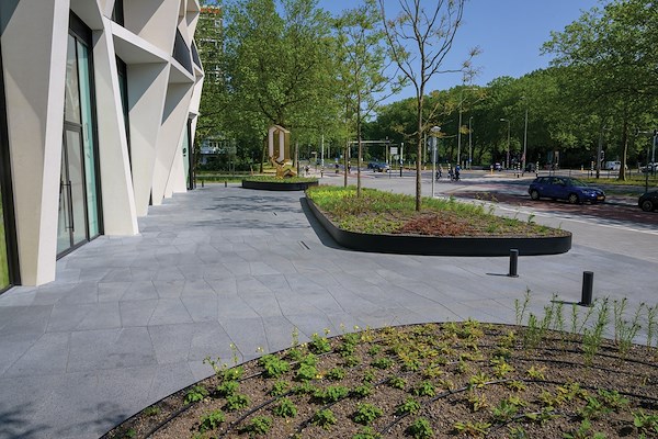 De twee appartement-gebouwen zijn met elkaar verbonden door een plein. Deltavormgroep en Piet Oudolf maakten samen het ontwerp van deze buitenruimte met luxe bestrating en stalen plantvakken en creëerden zo een prachtige plaza. De positionering van de plantenbakken geeft richting aan vloeiende looplijnen die rekening houden met de windval