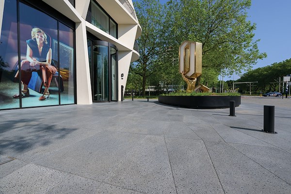 De platen in het plein hebben een grootformaat trapeziumvorm die samen een rustig golvend lijnenspel geven passend bij de gevel van het hoogste gebouw en die qua kleur mooi aansluiten bij de tegels van de gemeente. Het uiterlijk is diep donker geslepen en doet terrazo-achtig aan.
