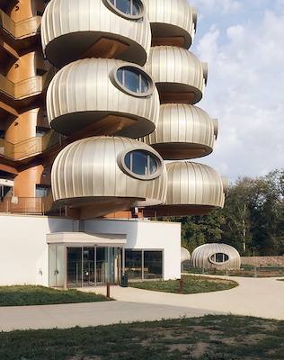 The unique Hotel L'EssenCiel with its bold architecture in the shape of a tree is part of the Domaine du Château des Pères in France. The hotel was designed by Jean-Paul Legendre and Unité Architecture Agency. The project was inspired by the structure of a supporting tree with floating bubbles hanging from its branches. These bubbles were realized with BEMO-MONRO® standing seam aluminium sheets.