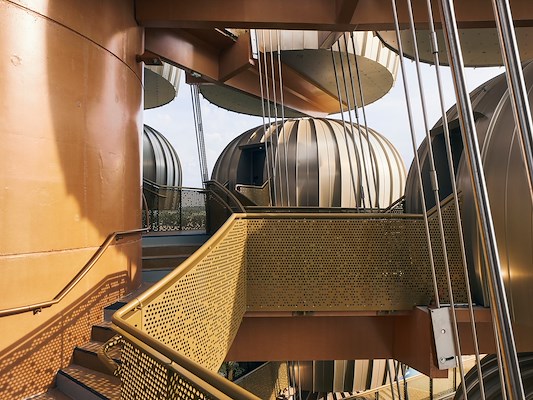 Surrounded by 31 hectares of wooded parkland, guests can stay in the floating aluminium cocoons and enjoy 4* service. The 42 domes of the hotel are connected to the 28m high tower and each one received an aluminium shell. Due to the cocoons' small area of 26m², the geometry of the individual profiles is very extreme. The BEMO-MONRO® standing seam profiles were realized with very small convex radii of less than 2,000mm - both horizontally and vertically in one track.