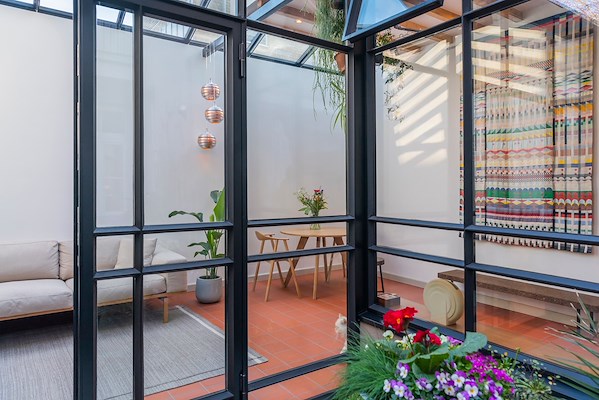 Het stalen skelet met glazen invulling zorgt voor een lichte en open ruimte waarin binnen en buiten in elkaar overlopen. De gevels en het dak van de aanbouw zijn opgebouwd uit geïsoleerde stalen profielen van het Zwitserse merk Forster. Deze ultraslanke profielen zijn voorzien van dubbel glas en aan de buitenzijde afgewerkt met Renoseal, een moderne vervanger van de klassieke stopverf. De glazen gevel en het dak worden deels ondersteund door een staalconstructie waarvan de kolommen in de houtskeletbouwwanden zijn opgenomen en de liggers in het zicht zijn gebleven. De nieuwe uitbreiding vervangt een bestaande aanbouw op een postzegellokatie. Door zijn inpassing in de bestaande omgeving is het geheel volledig op maat ontworpen. De locatie wordt aan drie zijden omsloten door buurpanden, dit maakt de inpassing uiterst complex. De drie buitenwanden die op de erfgrens liggen zijn vanwege de uitvoerbaarheid opgebouwd uit houtskeletbouw. Het stalen skelet sluit daarop aan en zorgt voor een openheid aan de tuinzijde. In het verlengde van de woning bevindt zich een dicht deel. Dit deel is voorzien van een groen dak met een 25cm dikke substraatlaag zodat het mogelijk is om hier bloemen en planten in te laten groeien. Het platte dak heeft aan de onderzijde de houten balklaag in het zicht waardoor er in de binnenruimte een mooie combinatie ontstaat tussen hout en staal. Het stalen skelet maakt een grote openheid van de ruimte naar de omgeving mogelijk. Door zijn inpassing vormt de uitbreiding een verlengstuk van zowel de woning als van de tuin. Een plek waar je alle dagen van het jaar van kunt genieten.