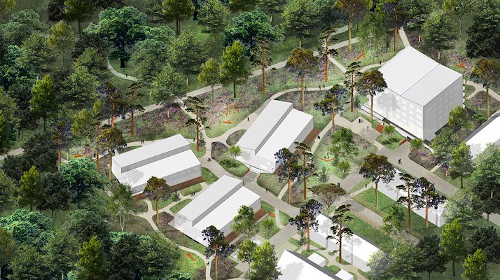 Alle bouwblokken hebben een stoere sculpturale uitstraling met verfijnde details. Een donkerbruine baksteen met houtkleurige accenten zorgt ervoor dat de gebouwen als het ware opgaan in het landschappelijke clair-obscur van naaldbomen en zandgrond.
