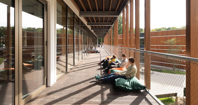 De bosrijke omgeving is een belangrijk onderdeel van de identiteit van De Amersfoortse Berg en inspireerde ons team bij het ontwerp, dat erop is gericht de groene omgeving zoveel mogelijk te ervaren; zowel binnen als buiten. We hebben de positionering van de nieuwe gebouwen zorgvuldig gekozen zodat er bijna geen bomen gekapt hoefden te worden. Bovendien nodigen onze oplossingen uit tot openluchtonderwijs. Ook de campusopzet draagt daar aan bij doordat leerlingen extra veel buiten komen, onder andere bij de wisseling van lessen. We vertellen graag wat meer over de campus en de verschillende gebouwen.