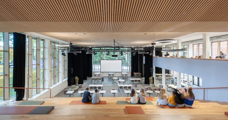 is aangevuld met twee nieuwe gymzalen en ondersteunende functies. De extra entree heeft een directe verbinding met het sportveld buiten voor een extra sportieve beleving. En daar waar de gymzalen grenzen aan het binnengebied zijn grote ramen zodat je van binnenuit het omringende landschap kunt zien en vanaf buiten de sportende leerlingen zichtbaar zijn.