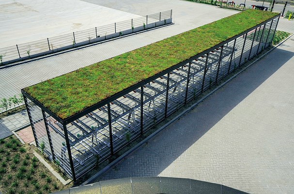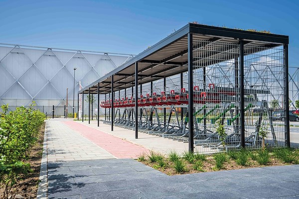 mogen ontwerpen, produceren en monteren. Het is een hoogwaardige fietsenstalling voor het personeel geworden, met een dak voorzien van sedum voor een groene uitstraling, die perfect aansluit bij het circulaire distributiecentrum.