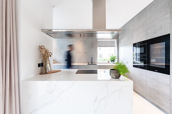 Een opvallend wit marmeren schiereiland breekt de ruimte. De bovenste verdiepingen laten ook een combinatie van houten en betonnen maatwerk zien. Na het ontwerpen zorgden wij voor een turnkey oplevering met bijhorende bouwbegeleiding.