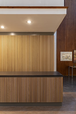 Met het materiaalgebruik sluiten we aan op bestaande elementen in de zaal, zoals de houten wandafwerking aan weerszijden van het balkon. Deze uitstraling willen we terugbrengen in het nieuwe meubel. Daarnaast creëren we een intiemer gevoel door een hoge lambrisering in een accentkleur die aansluit op tinten uit het bestaande metselwerk. Zo creëren we een warmere uitstraling en meer eenheid. De intimiteit versterken we door een nieuw niveau verlichting aan te brengen. Door tussen de vier kolommen een rail met spots te plaatsen wordt deze ruimte extra benadrukt. Daarnaast kunnen hiermee het podium en de exposities extra uitgelicht worden.
