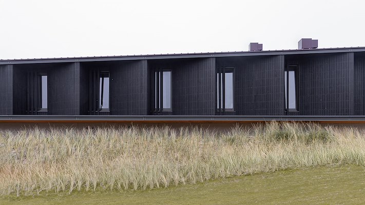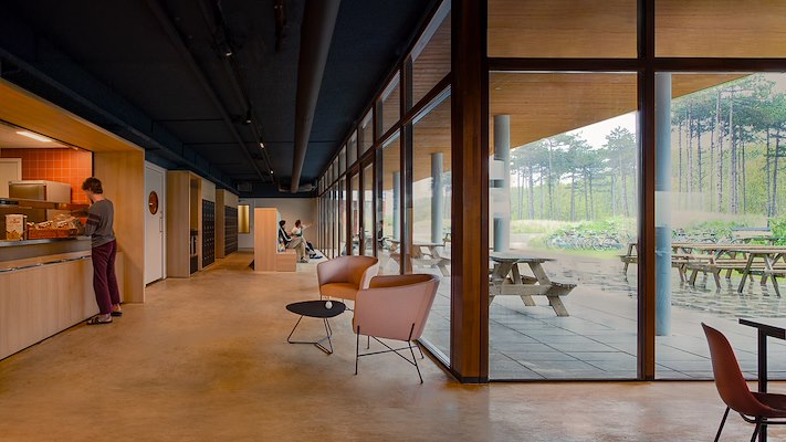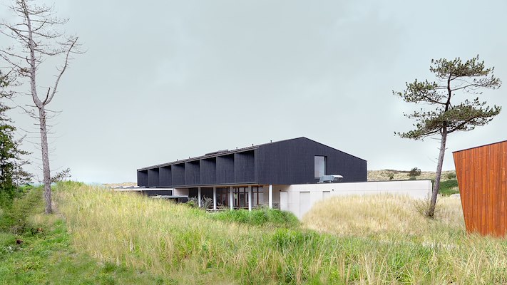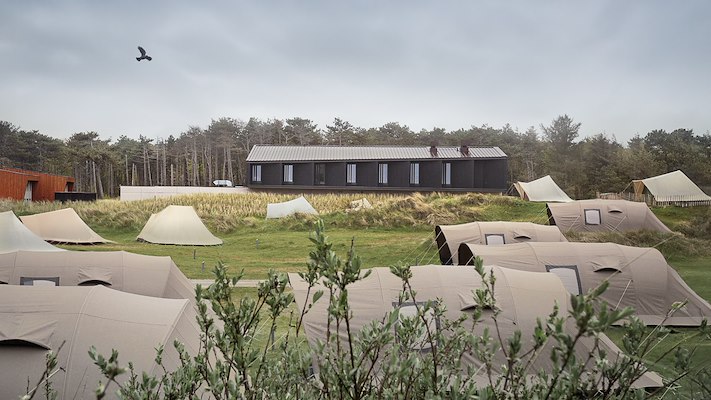 Om te voorkomen dat dit gebouw op de camping te kolossaal overkomt en om het naadloos in het landschap te integreren, hebben de ontwerpers gekozen voor een innovatieve aanpak. Ze hebben een zware betonnen onderbouw ontworpen die in het duin kan verzinken. Aan de boszijde heeft het een groot terras met een overkapping voor bescherming tegen de elementen. Boven het maaiveld bevinden zich de slaapkamers in een houten opbouw met ramen in verdiepte nissen voor privacy, waardoor de gevel een intrigerend uiterlijk krijgt met een schuine noklijn.