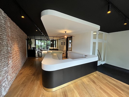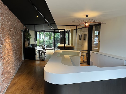 Er is een uitnodigende receptiebalie aan de voorkant gecreëerd, die fungeert als het hart van het kantoor. Daarnaast is er aan de achterkant een stijlvolle kantine ontworpen, gescheiden door een elegante glazenwand.