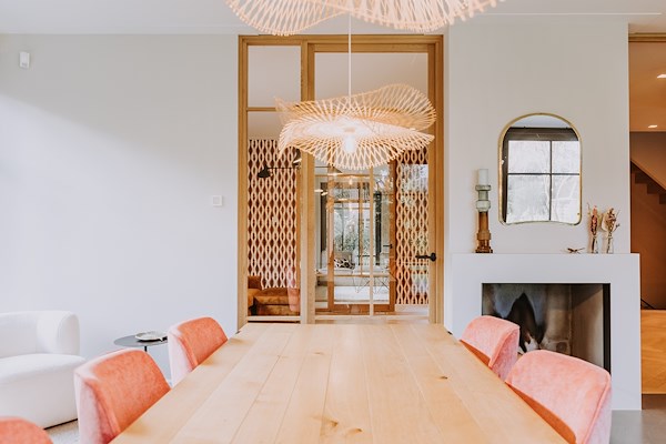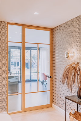 In deze sfeervolle woning in Blaricum zijn de ruimtes af te scheiden met prachtige eiken maatwerk deuren. Ondanks de afsluiting is er nog een grote hoeveelheid licht en sfeer aanwezig. De binnendeuren die in deze villa zijn gerealiseerd noemen we model 'Berlin' en zijn van massief eiken hout. Dit houtsoort matcht ontzettend goed met de vloer in deze prachtige villa!