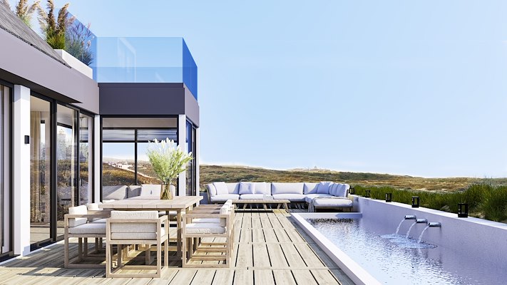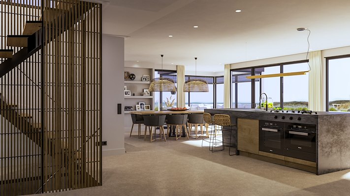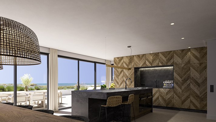 Ergens aan het strand in Nederland staat dit huis met een gedateerde jaren 80 architectuur. De eigenaar vroeg VKV Visuals om een plan te maken om het pand een make-over te geven, zowel het exterieur als het interieur. De indeling van de begane grond werd open getrokken, en is er een extensie van het souterrain ontworpen met gastenverblijf. Het terras werd in de diepte verlengd om plaats te maken voor een langgerekt zwembad. VKV Visuals kreeg de vrije hand voor het interieur ontwerp, waar invloeden van het strandleven in doorgevoerd zijn.