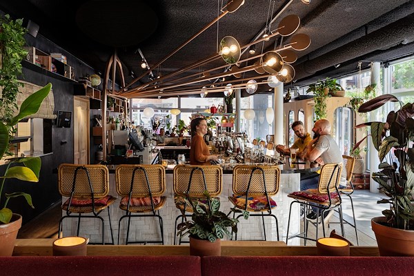 Centraal in de ruimte is de open bar met erboven als ‘eyecatcher’ een koperen lichtsculptuur te bewonderen. Deze is geïnspireerd op de stralen van een ondergaande zon, het symbool van op reis zijn. De bar deelt de ruimte in drie zones: rechts de lounge, in het midden de borrel en links het restaurant. Tegen de volledige achterwand is een ‘kast’ gepositioneerd, welke is opgebouwd uit sloppenwijk materialen zoals snelbouwstenen, blauwstaal en verweerde houtblokken. Deze ‘Cabinet of Curiosities’ is gevuld met reisobjecten en verhalen afkomstig van wereldreizigers welke de opdrachtgevers op reis hebben ontmoet. De twee nissen aan weerszijden van de kast zijn opgebouwd uit snelbouwstenen. Op de zijwand is een ‘street-art mural’, met daarop gelukssymbolen, geschilderd welke je zomaar op reis had kunnen bewonderen. In je ontdekkingstocht wordtje in de toiletten verwelkomd door een gorilla-kop, welke dier soort Hanno uit Carthago heeft ontdekt. Daarnaastwordt het interieur gekarakteriseerd door weelderige planten, kleurrijke patronen, ruwe en pure materialen.