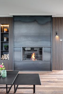 Lamellen met staleskaders voor tv en kast, stalen haard